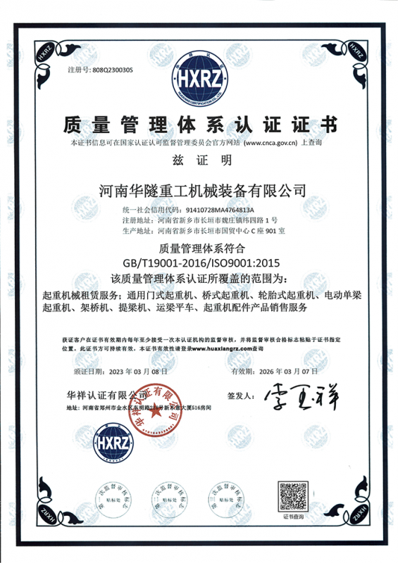 河南華隧重工機(jī)械裝備有限公司主要從事通用門式起重機(jī)、橋式起重機(jī)、電動(dòng)單梁起重機(jī),輪胎式起重機(jī)、架橋機(jī)、提梁機(jī)、遠(yuǎn)梁平車、鋼絲繩電動(dòng)萌蘆、卷?yè)P(yáng)機(jī)、起重配件制造、銷售:起重機(jī)械租賃、安裝和維修,起重設(shè)備園收,機(jī)械設(shè)備維修,鋼結(jié)構(gòu)工程承包,橋梁工程及技術(shù)咨淘服務(wù),銷售五金制品、機(jī)電設(shè)備:建設(shè)工程監(jiān)理,建設(shè)工程設(shè)計(jì),各類工程建設(shè)活動(dòng),建筑勞務(wù)分包,建筑物折除作業(yè),施工作業(yè),工程管理服務(wù),土石方工程施工,裝如發(fā)運(yùn)。  公司已通過IS0國(guó)際質(zhì)量、環(huán)境、健康與安全三合一標(biāo)準(zhǔn)認(rèn)證,特種設(shè)備制造許可證和特種設(shè)備安裝改造維修許可證。擁有完熟的質(zhì)量管理體系。嚴(yán)格的管理制度,強(qiáng)大的生產(chǎn)能力和先進(jìn)的檢測(cè)手段,在保證產(chǎn)品質(zhì)量的同時(shí),也具備了極強(qiáng)的市場(chǎng)競(jìng)爭(zhēng)力。  公司堅(jiān)持科技創(chuàng)新為理念,產(chǎn)品質(zhì)量為核心,注重信譽(yù),建立了減信可靠、快捷、思速。便利周到的售后服務(wù)網(wǎng)絡(luò)。  我們擁有的技術(shù)專家和技術(shù)服務(wù)隊(duì)伍為客戶提供充善的售前技術(shù)支持和全天候的售后服務(wù)體系,讓您無(wú)后顧之憂,享受一站式的超值服務(wù)。  “華隧重工,伴您成功“是華隧重工永遠(yuǎn)的宗指,真被的希望與各界朋友攜手并進(jìn)。共創(chuàng)輝準(zhǔn)!